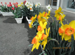 年度初めの活動は、ボランティア活動からスタートが当支部の恒例で、前年秋の10月に200個の球根をプランター24ケに植え付けて越冬し、早春に「ややつぼみ膨らむ状態」まで待ってから特別養護老人ホーム「垂水の里」に配達し、明るいインパクトの強い黄色のスイセンで人目を惹くように組み立てて玄関前に並べて赤・黄色・白・紫のチューリップの花と周辺の桜の満開とマッチさせるのを狙っていました。